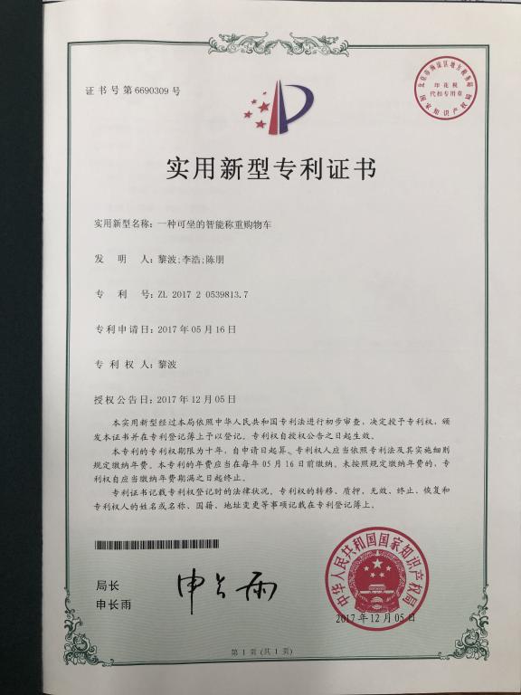 美术系黎波老师设计《一种可坐的智能称重购物车》获国家实用新型专利授权