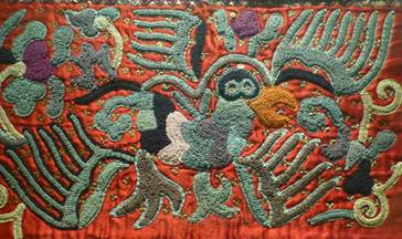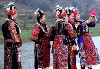 她还和我们分享了丰富多彩的苗族刺绣题材,有龙、鸟、鱼、铜鼓、花卉、蝴蝶,还有反映苗族历史、生活、习俗的画面。从而得知了是苗族刺绣就像族徽一样具有宗支传承并充分体现了民族的身份信息。苗族姑娘刺绣时,有的仅凭对大自然事物的观察和感受,不起草,信手绣出;有的在布面上画好图案再绣;有的用剪纸粘贴进行刺绣。凭自己天生的悟性、娴熟的技艺、非凡的记忆力、丰富的想象力,布局谋篇,将单独的图形巧妙组合,形成了一个丰满的绣品,达到和谐完美的艺术作品。苗绣讲究对称美、均衡美。突出了现代的形式美法则,无论上下左右位置的图形、色彩、空间,都讲究对称、均衡;并且整个绣品不留空白;用色大胆,大红大紫,鲜亮夺目。他们用装饰纹样来美化生活,借丰富的物象来反映喜庆、吉祥、等生活内容,表达自己的感情和内心的憧憬。也以图腾崇拜的方式崇拜着与自己的祖先有血缘关系的动植物。这些都令我们对苗族女性油然而生一种感动和崇敬。