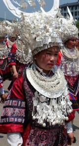 苗族是一个勇敢智慧的民族,古代战争时,传说苗族先民为了抵御外来入侵,用水牛的牛角装扮头饰,让自己显得更加威武雄壮,以震慑敌人,后来这种做法果然为苗族先民赢得战争发挥了作用。之后,这种装饰习俗就沿袭了下来。雷山苗族节日盛装中佩戴的大银角,外形好似一个水牛角,角非常长,戴在头上高高耸起,这是苗族祖先崇拜意识的物化,也是苗家人在银饰上以大为美的体现。当然,苗族银饰里还有许许多多美丽的故事,藏着苗家人对祖先的崇敬,对自然的敬仰,对生活的热爱以及对美的向往和追求。