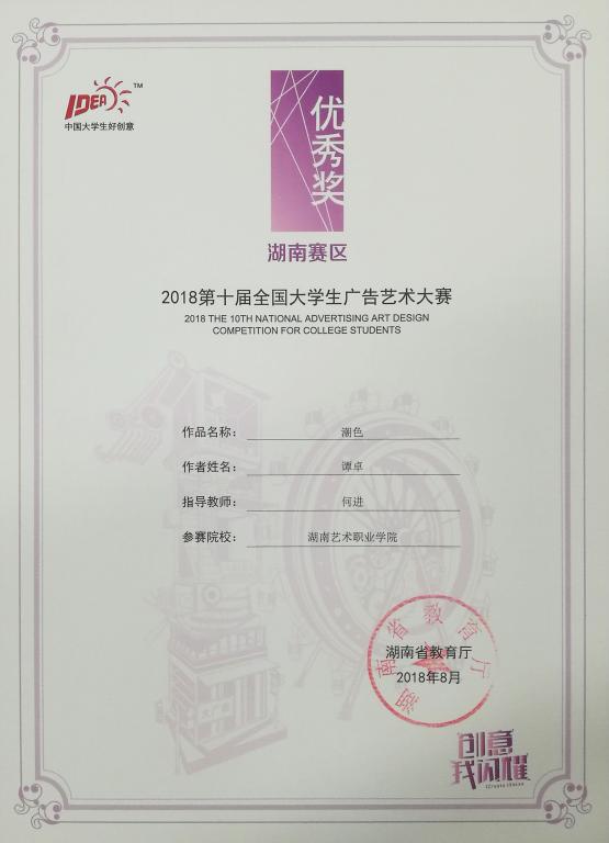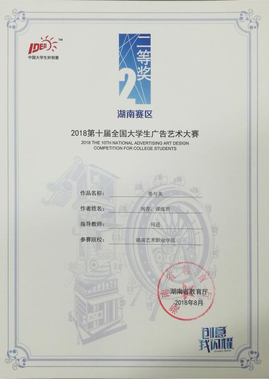 据悉,第十届全国大学生广告艺术大赛湖南共有65所高校参赛,在大广赛官网提交作品11915件,经各高校评选后提交到湖南赛区的作品共5300件,经评审委员会评审,湖南省大学生广告艺术设计竞赛评审领导小组审议,共有846件作品获奖,占作品总数15.96%。其中,一、二、三等奖的获奖率分别为1.53%、2.98%和5.62%。