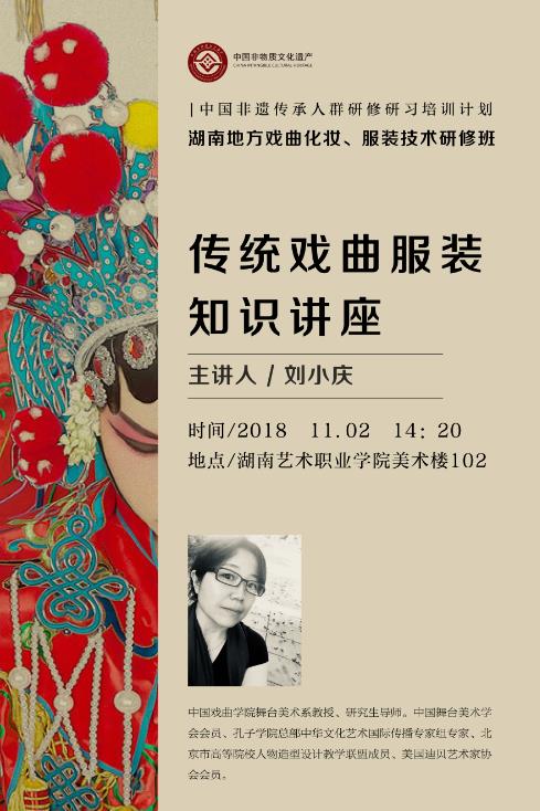 2018年11月2日下午,按照“湖南地方戏曲化妆、服装技术研修班”的课程安排,我院邀请中国戏曲学院刘小庆教授在美术楼102教室为师生做《传统戏曲的美学特征》课程讲座。刘小庆,中国戏曲学院舞台美术系教授、研究生导师,高等院校人物造型设计教学联盟成员,美国迪贝艺术家协会会员。