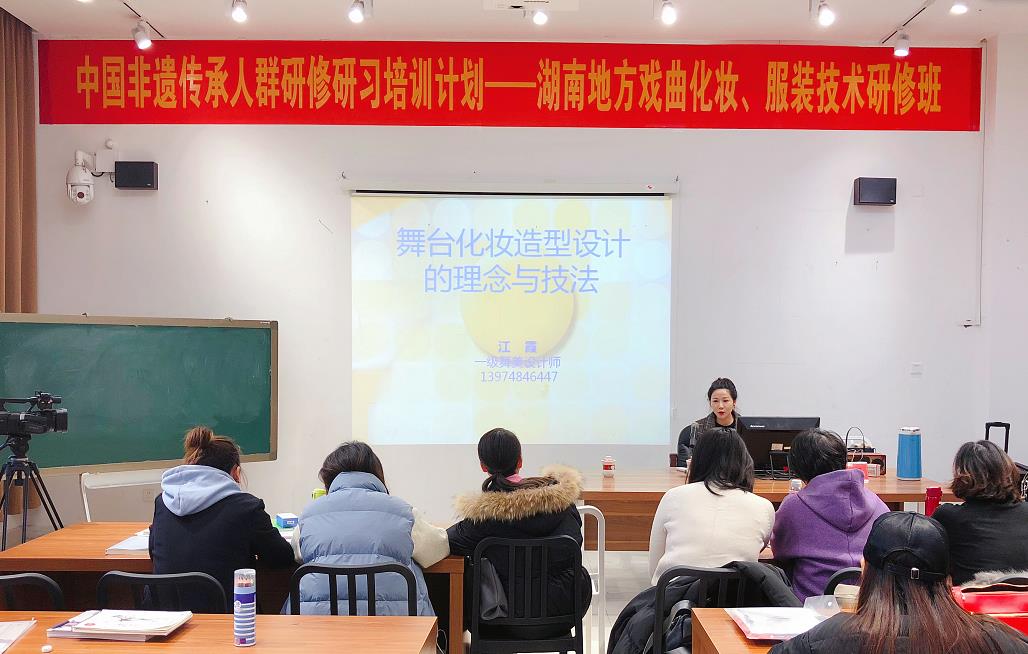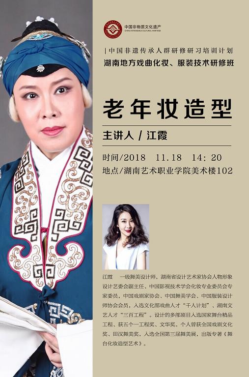11月18日下午,我院特邀国家一级舞美设计师江霞老师在美术楼102教室做《老年妆造型》课程讲座。 江霞老师是湖南省设计艺术家协会人物形象设计艺委会副主任、中国影视技术学会化妆专业委员会专家委员,中国戏剧家协会、中国舞美学会、中国服装设计师协会会员,入选文化部戏曲人才“千人计划”、湖南文艺人才“三百工程”。设计的多部剧目入选国家舞台精品工程、获五个一工程奖、文华奖。个人曾获全国戏剧文化奖、田汉舞美奖,入选全国第三届舞美展,出版专著《舞台化妆造型艺术》。