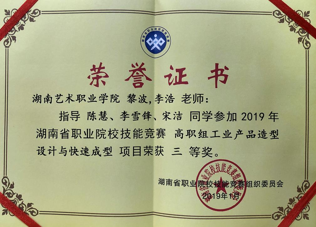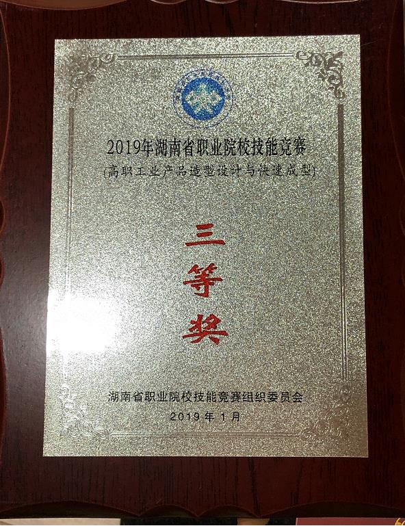2018年12月24—26日,湖南省职业院校技能竞赛“高职组工业产品造型设计与快速成型”项目在湖南工业职业技术学院赛点举行。我院美术系产品艺术设计师生在比赛中发挥稳定,在20多个参赛队中,以总分81.8的成绩获得“三等奖”。