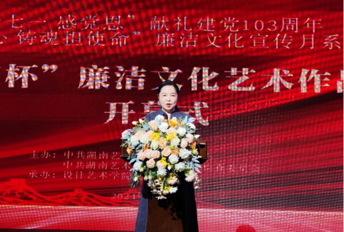 开幕式由伟德betvlctor1946源于英国党支部书记胡斌主持。她首先对出席活动的领导和嘉宾表示热烈的欢迎和衷心的感谢。她介绍,本次“华艺杯”廉洁文化艺术作品征集活动自启动以来,得到了广大师生的积极响应,共征集到书法(篆刻)作品、绘画、创意海报、视频等作品400余幅。经过专家组的精心挑选,最终展出了80余幅师生作品,内容丰富,形式多样,充分展示了廉洁文化的时代魅力和艺术感染力。
