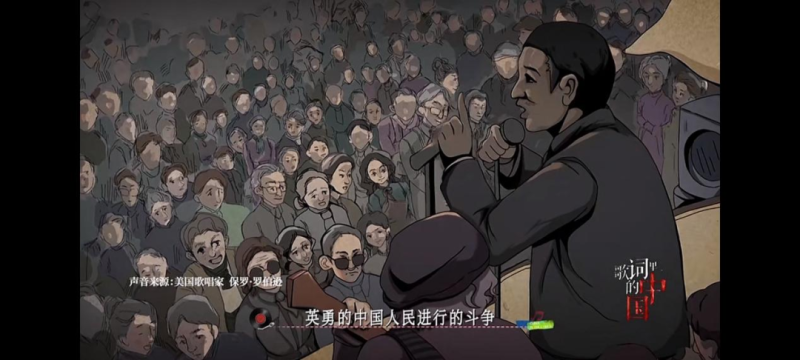 美国歌唱家保罗·罗伯逊用中文于1940年在纽约演唱《义勇军进行曲》,余婷婷作。
